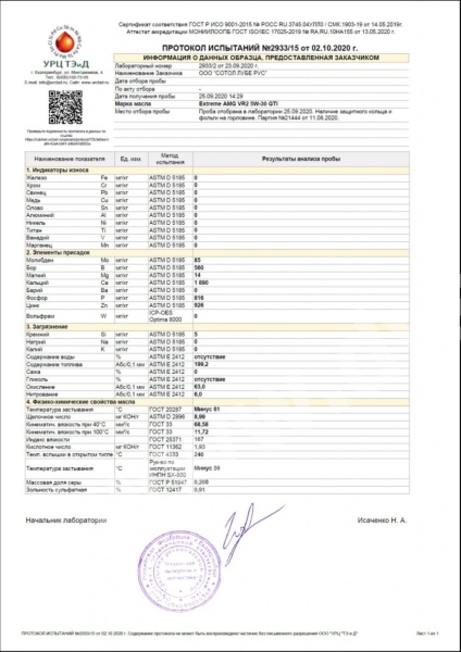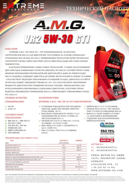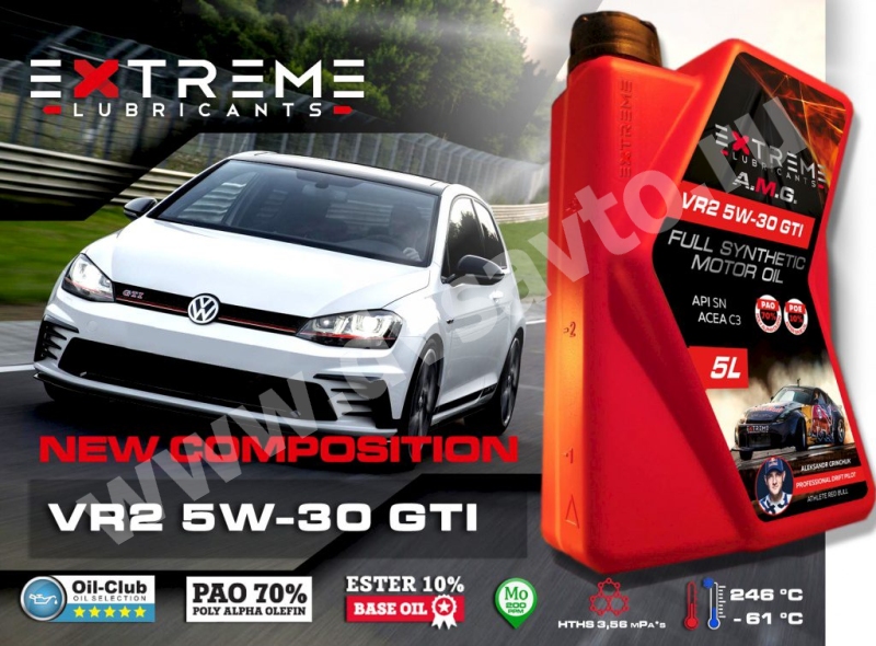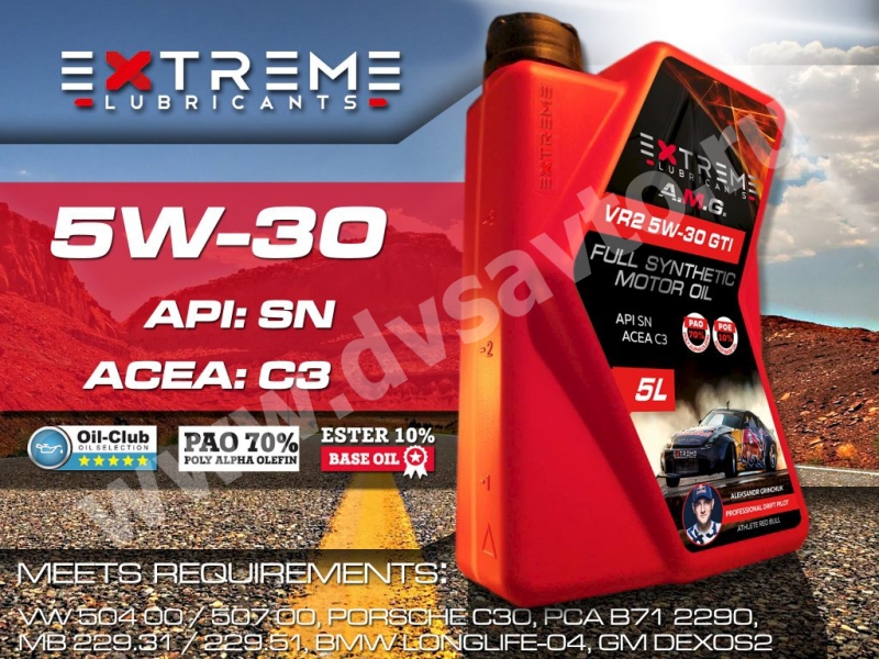 EXTREME AMG VR2 5W30 GTI – это полностью синтетическое моторное масло на PАО и ESTER для бензиновых и дизельных двигателей с (без) турбонаддувом и прямым впрыском топлива. Масло характеризуется отличными показателями при холодном запуске, уменьшенным трением и износом. EXTREME A.M.G. VR2 5W-30 GTI увеличивает срок службы дизельного сажевого фильтра посредством уменьшенной концентрации зольных частиц в выхлопных газах. Снижает выброс вредных веществ в окружающую среду. Обеспечивает повышенную безопасность, высокий уровень защиты двигателя. Достигается это за счёт высокого индекса вязкости благодаря использованию специальных базовых масел. Увеличенные интервалы замены масла в соответствии с инструкциями изготовителя.
